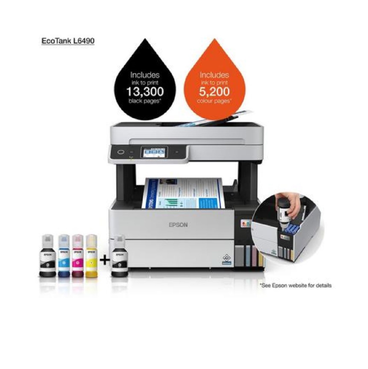 • Easy to use front ink tank Enjoy hassle-free refills with enhanced ink bottles