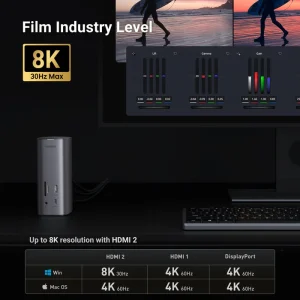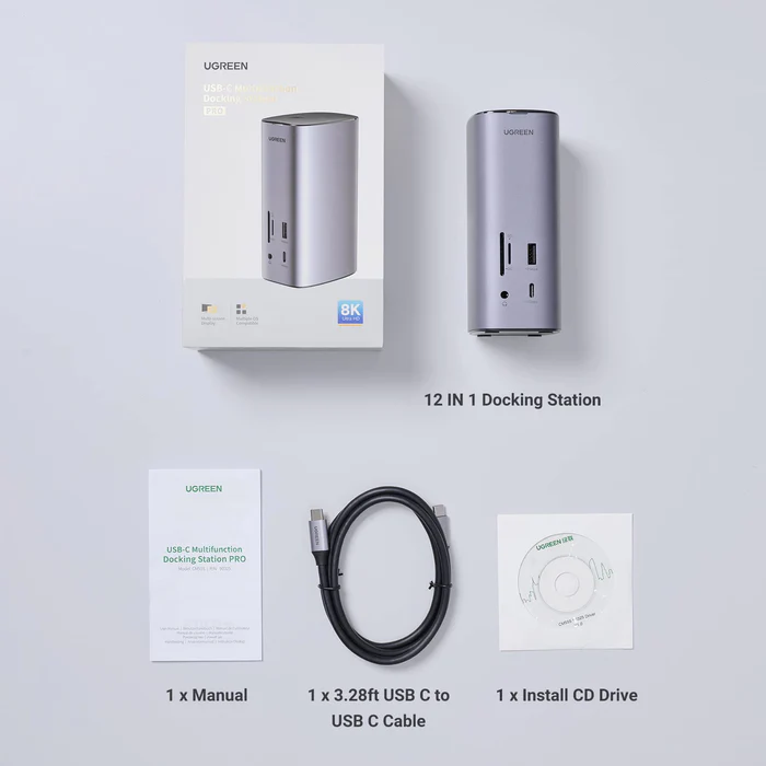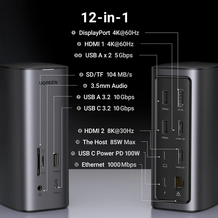 UGREEN 12-in-1 USB-C Multifunction Docking Station Pro – CM555 USB-C to SD/TF Card Slot + USB-A 3.2 Gen 2 + 3.5mm Port + USB-C 3.2 Gen 2 + DisplayPort (4K@60Hz) + USB-A 3.2 Gen 1 (2 Ports) + HDMI (4K@60Hz) + HDMI (8K@30Hz) + RJ45 Gigabit Ethernet + USB-C PD