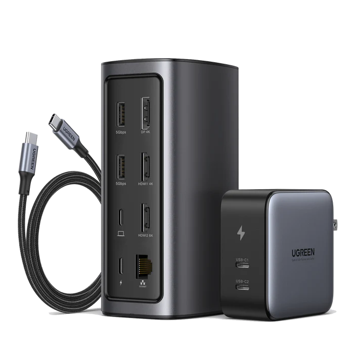 UGREEN CM555 12-in-1 Docking Station Pro transforms your USB-C laptop into a full workstation with triple display support, 100W fast charging, 10Gbps data transfer, and Gigabit Ethernet—all in a sleek, aluminum body.